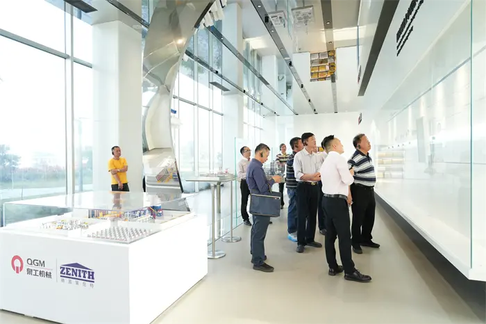 தலைவர் Lin Boqian மற்றும் அவரது தூதுக்குழுவினர் முதலில் Quangong Co., Ltd. இன் வளர்ச்சி வரலாற்றின் கண்காட்சி அரங்கிற்குச் சென்றனர், மேலும் கிராஃபிக் காட்சி பலகைகள், காணொளிப் பொருட்கள் மற்றும் உடல் கண்காட்சிகள் மூலம், நிறுவனம் அதன் தொடக்கத்திலிருந்து ஒரு தொழில்துறைத் தலைவராக மாறுவதற்கான போராட்டத்தை முழுமையாகப் புரிந்துகொண்டனர். Quangong இன் பொறுப்பாளர், Quangong Co. Ltd. 40 ஆண்டுகளுக்கும் மேலாக செங்கல் இயந்திர உபகரணத் துறையில் செய்துள்ள புதுமையான முன்னேற்றங்களையும், "கைவினைத்திறன் தரத்தை உருவாக்குகிறது, மேலும் தொழில்நுட்பம் எதிர்காலத்தை வழிநடத்துகிறது" என்ற பெருநிறுவனத் தத்துவத்தையும் விரிவாக அறிமுகப்படுத்தினார். தொழில்நுட்ப ஆராய்ச்சி மற்றும் மேம்பாடு மற்றும் தொழில் மேம்பாடுகளை ஊக்குவிப்பதில் Quangong Co., Ltd. இன் சாதனைகளை தலைவர் லின் போகியன் மிகவும் பாராட்டினார்.